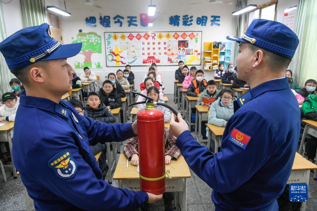 2月8日,在四川省廣安市廣安區思源小學6年級7班,消防員向學生講解滅火器的使用技巧。