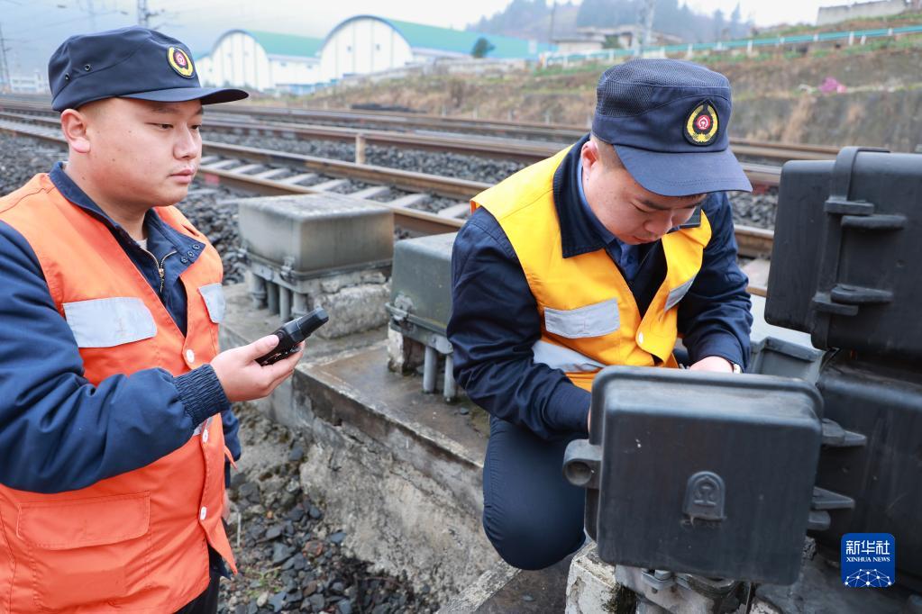 2月8日,貴陽電務段工作人員攜帶著北斗防護系統設備進行作業。