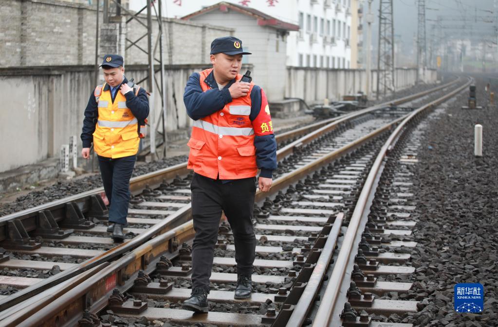 2月8日,貴陽電務段工作人員攜帶著北斗防護系統設備前往作業地點。
