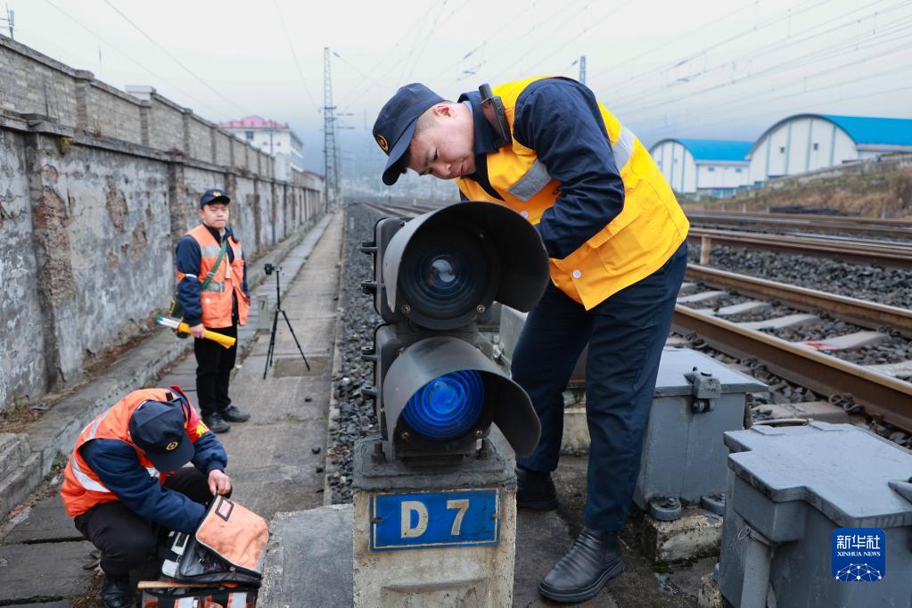 2月8日,貴陽電務段工作人員佩戴著北斗防護系統設備進行作業。