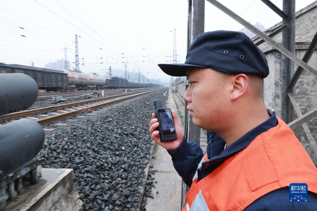 2月8日,貴陽電務段工作人員利用北斗防護系統設備與后臺聯絡。