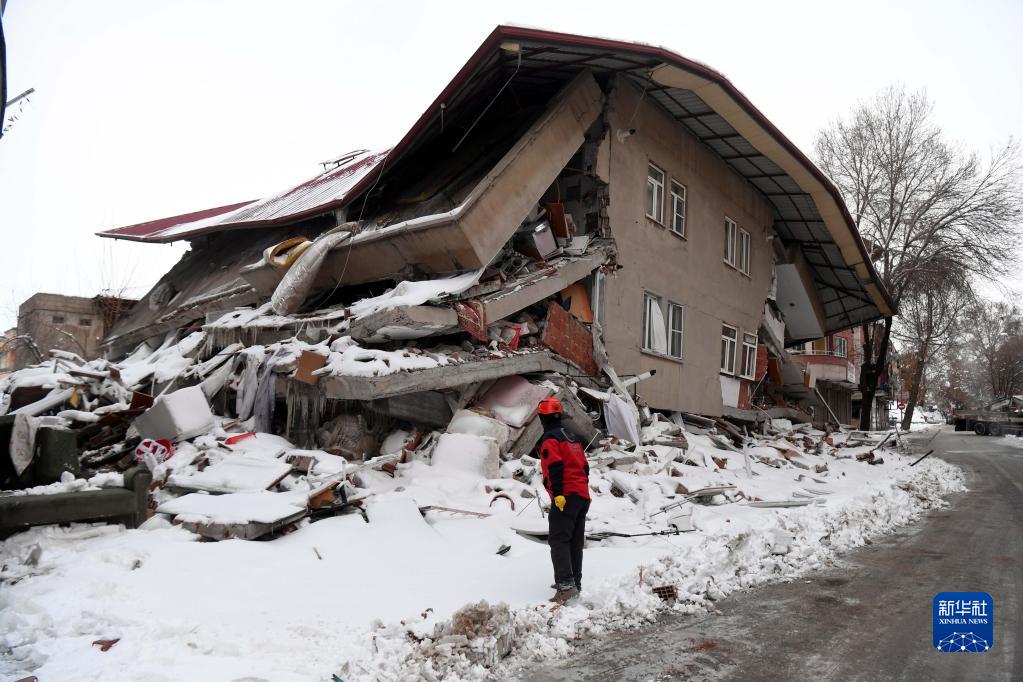 2月7日,在土耳其卡赫拉曼馬拉什省南部的埃爾比斯坦地區,救援人員在一處受損建筑外喊話。