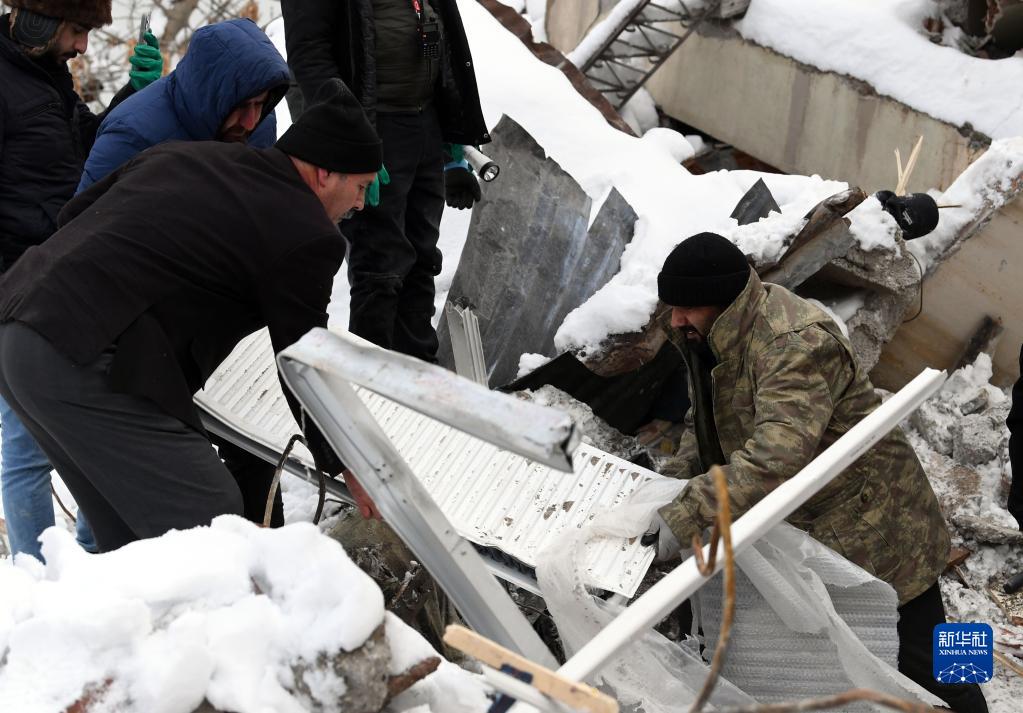 2月7日,在土耳其卡赫拉曼馬拉什省南部的埃爾比斯坦地區,救援人員在一處地震廢墟搜救。