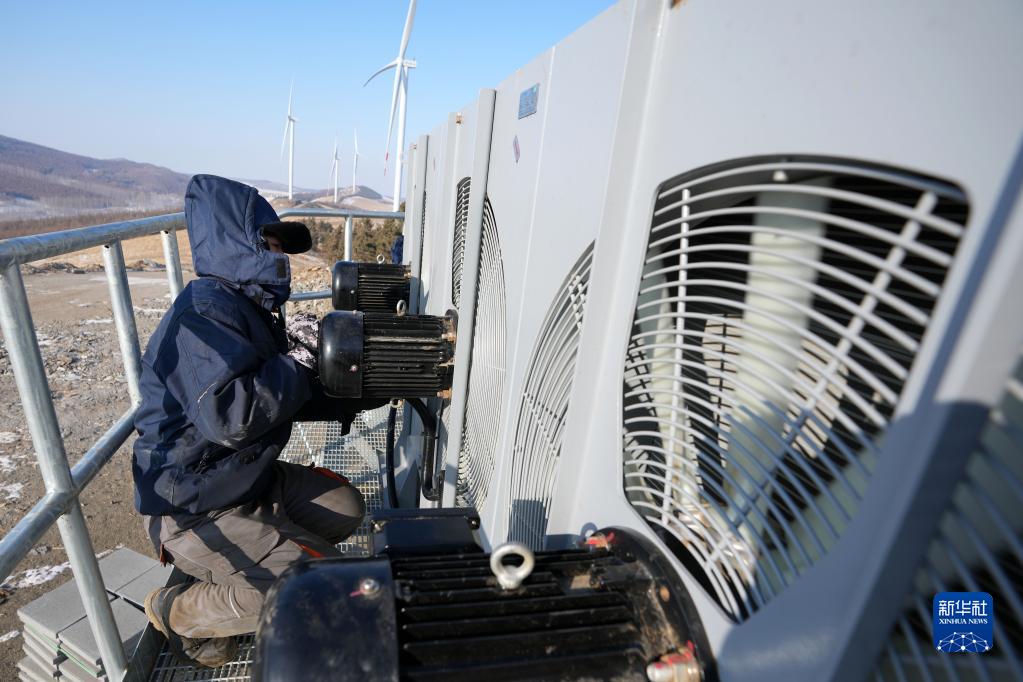2月7日,在華電黑龍江區域哈爾濱依蘭雞冠山風電場三期工程一處運行的風電機組,工作人員在進行巡檢。