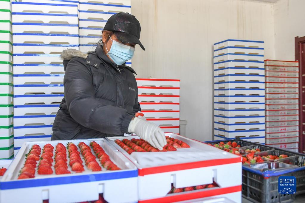 2月7日,在梨樹縣梨樹鎮九九香農業有限責任公司,農民將剛采摘的草莓分等包裝。
