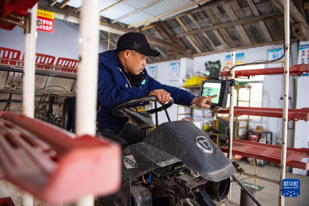 2月8日,在鼎城區國家現代農業產業園一處農機維保站,工作人員在調試一臺無人駕駛插秧機。