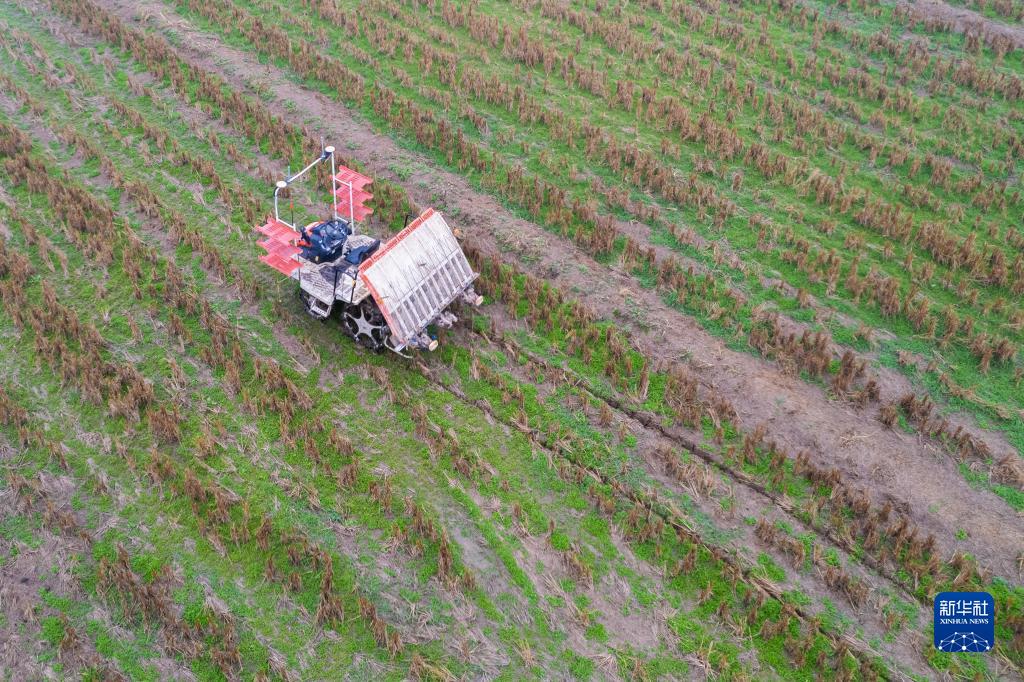2月8日,一輛無人駕駛插秧機在鼎城區國家現代農業產業園田間調試(無人機照片)。