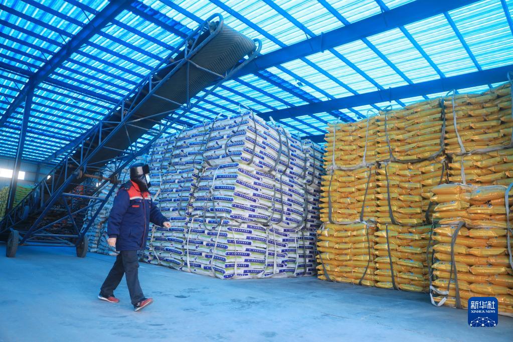2月6日,在鐵嶺縣愛爾法農業科技(遼寧)有限公司倉庫,工人在查看化肥儲存情況。