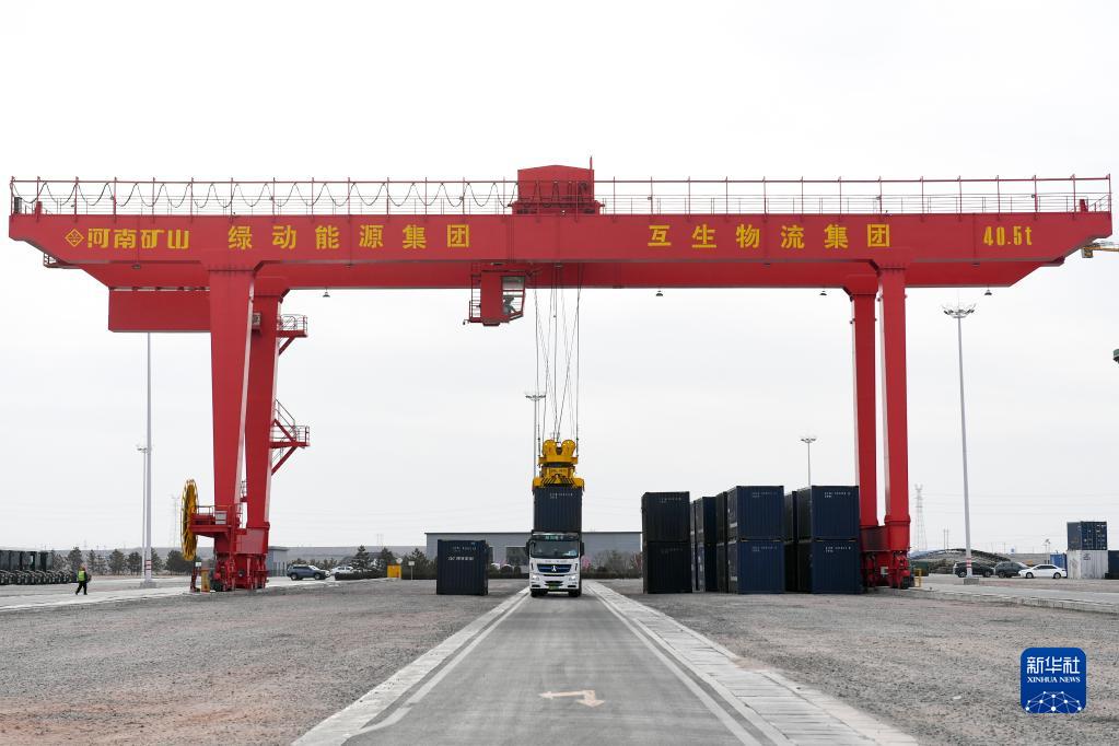 2月8日,新能源重卡在鄂爾多斯市東勝區綠動萬利新能源智慧陸港內裝運集裝箱。