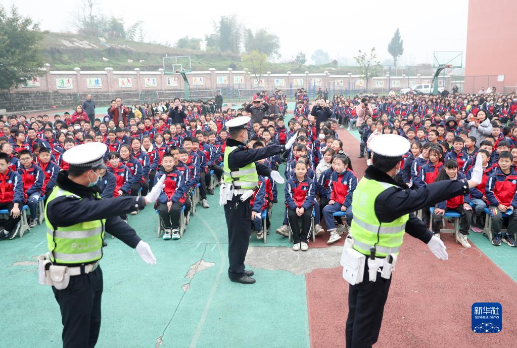 2月8日,四川省華鎣市交警在銅堡中學給學生展演交通安全手勢操。