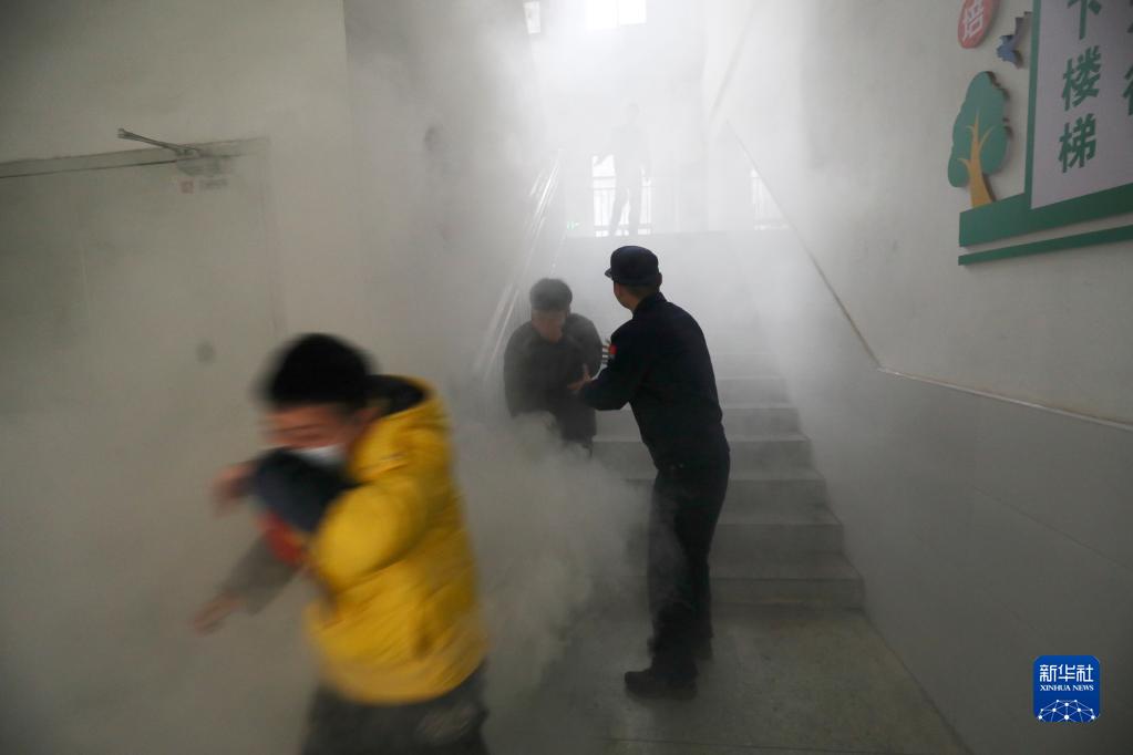 2月8日,在湖南省資興市第三完全小學,學生在消防救援隊員的指導下參加消防疏散逃生演練。