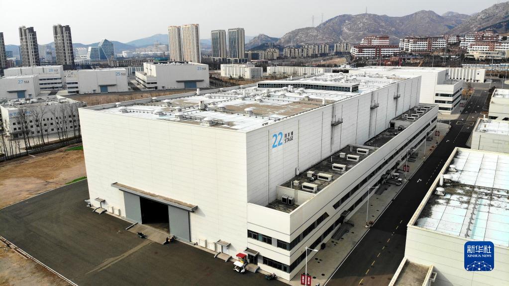 青島東方影都影視產業園內面積達1萬平方米的22號攝影棚(2月8日攝,無人機照片)。
