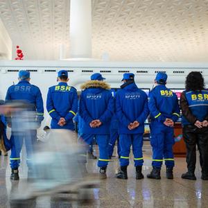2月8日,藍天救援隊隊員在機場大廳內搬運行李物資。