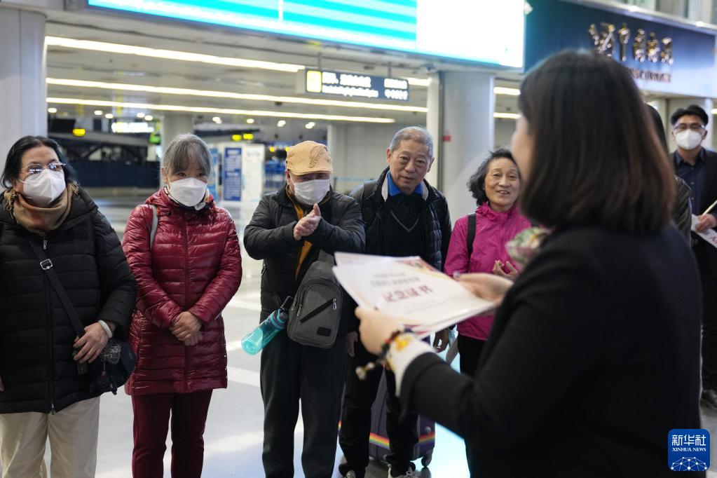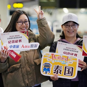 2月8日,在北京首都國際機場2號航站樓,中青旅遨游網工作人員在為前往泰國旅游的游客發放紀念證書。