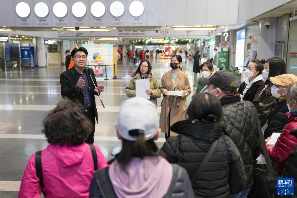 2月8日,在北京首都國際機場2號航站樓,中青旅遨游網領隊為前往泰國旅游的游客講解出行安排。