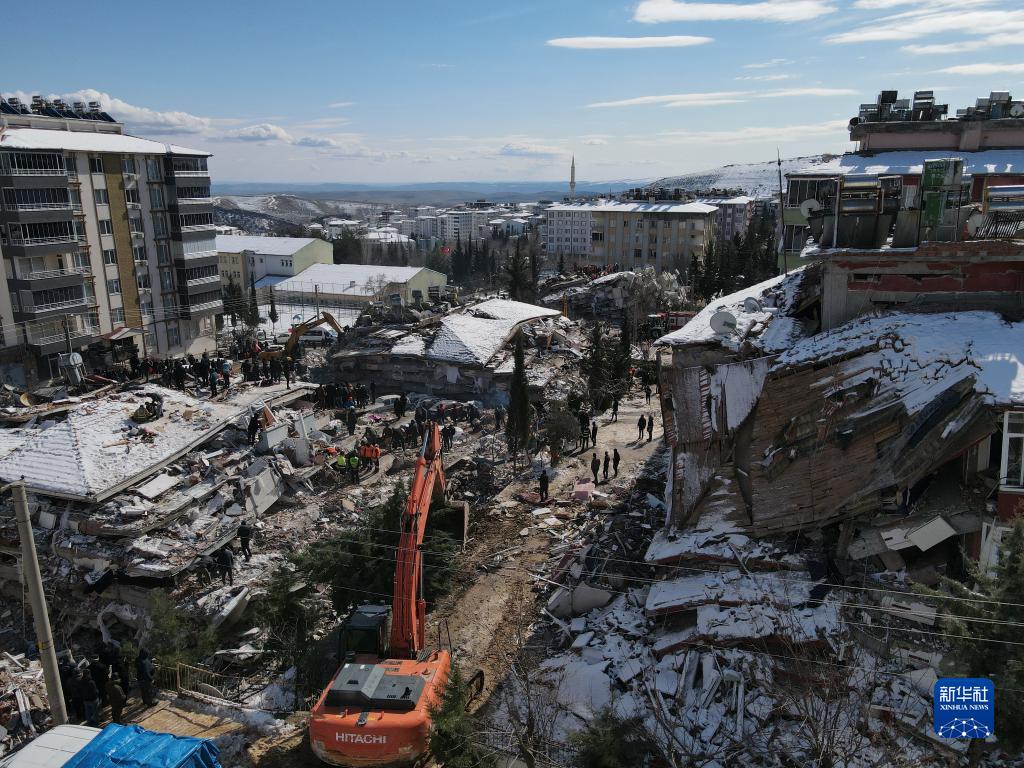 2月8日,在土耳其阿德亞曼省貝斯尼,救援人員在地震廢墟搜救(無人機照片)。