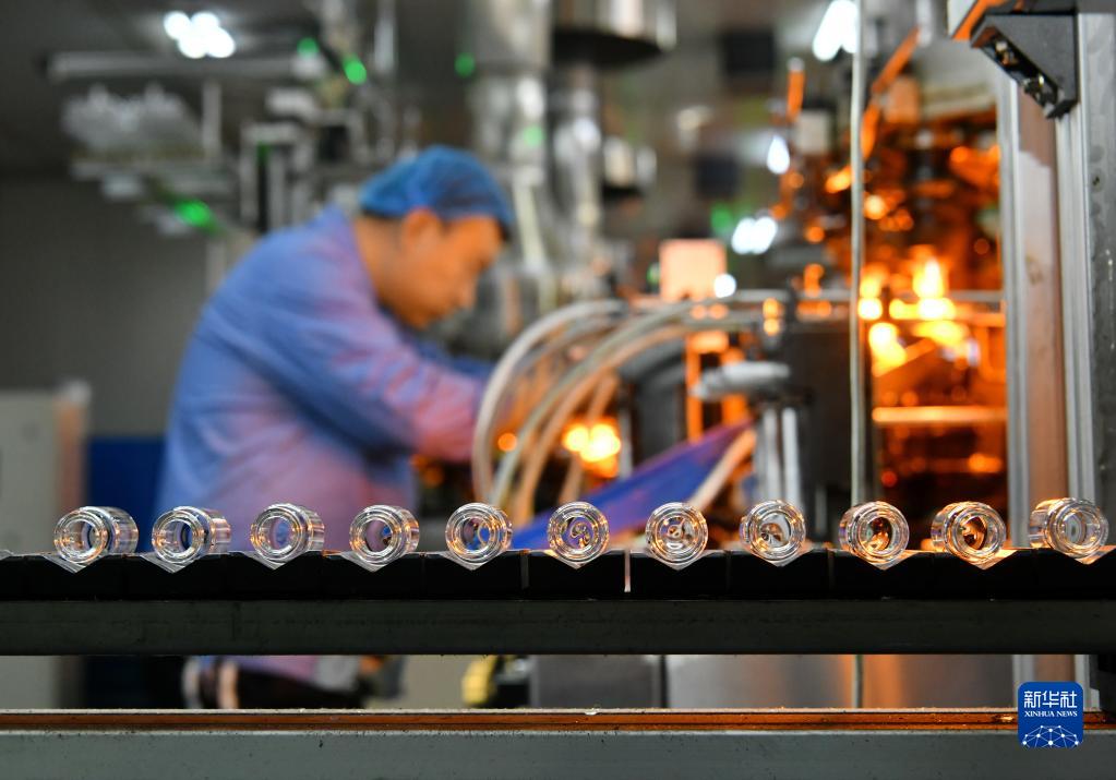 2月8日,在位于河北省滄縣的滄州四星玻璃股份有限公司,工人在藥用中性硼硅玻璃管制瓶車間工作。