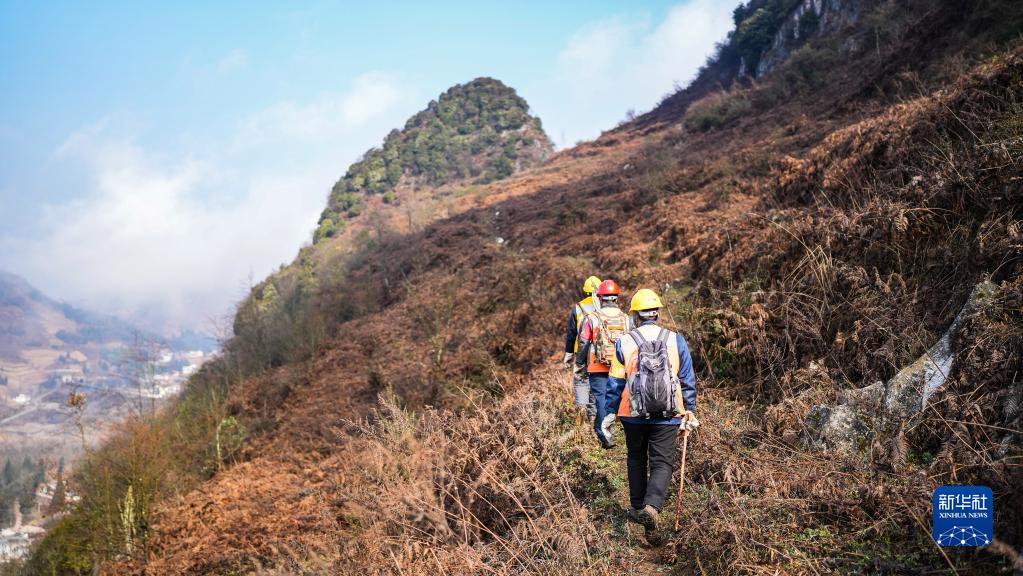 六盤水工電段職工在滬昆鐵路茨沖至濫壩區段登山巡檢(2月8日攝)。