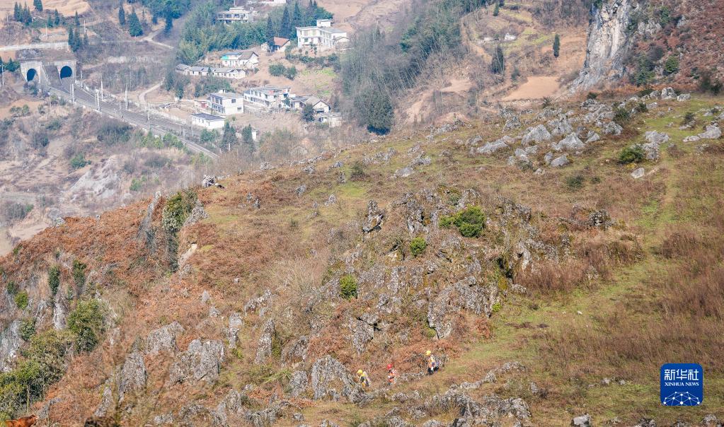 六盤水工電段職工在滬昆鐵路茨沖至濫壩區段登山巡檢(2月8日攝)。