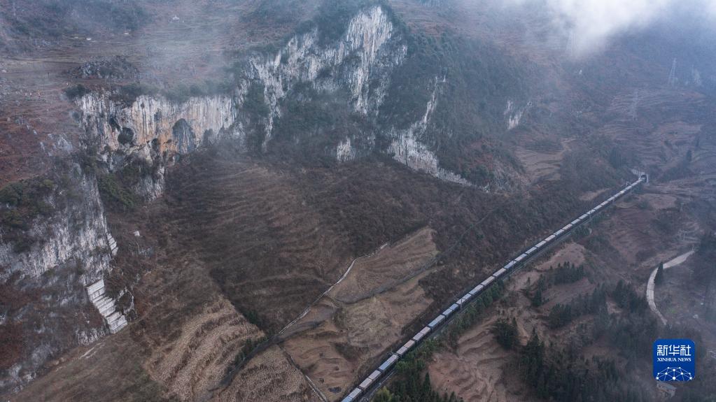 列車從滬昆鐵路茨沖至濫壩區段駛過(2月8日攝,無人機照片)。