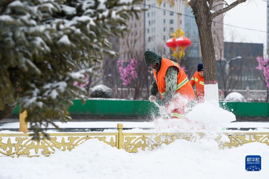 當日,內蒙古鄂爾多斯市迎來降雪天氣,路面出現積雪。當地環衛部門組織人力和大型機械清掃路面,保障市民出行安全。