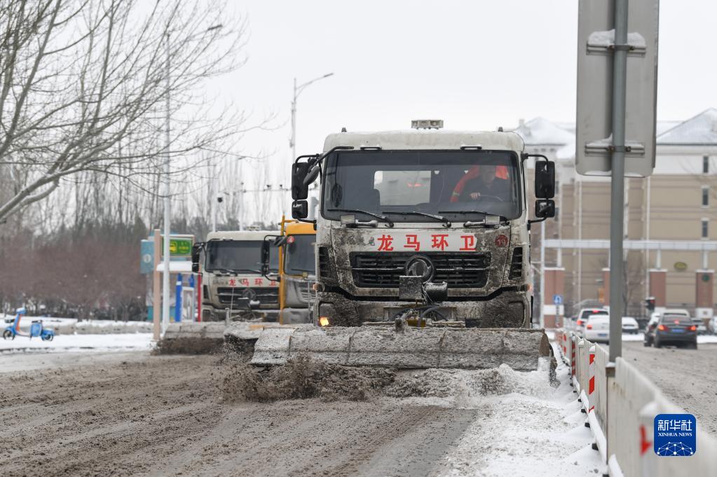 當日,內蒙古鄂爾多斯市迎來降雪天氣,路面出現積雪。當地環衛部門組織人力和大型機械清掃路面,保障市民出行安全。
