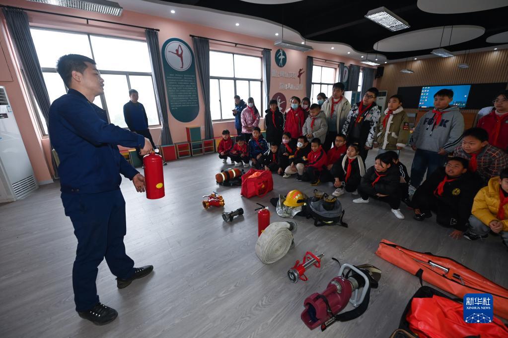2月9日,東林鎮應急救援隊的隊員在東林鎮第二小學上消防安全課。
