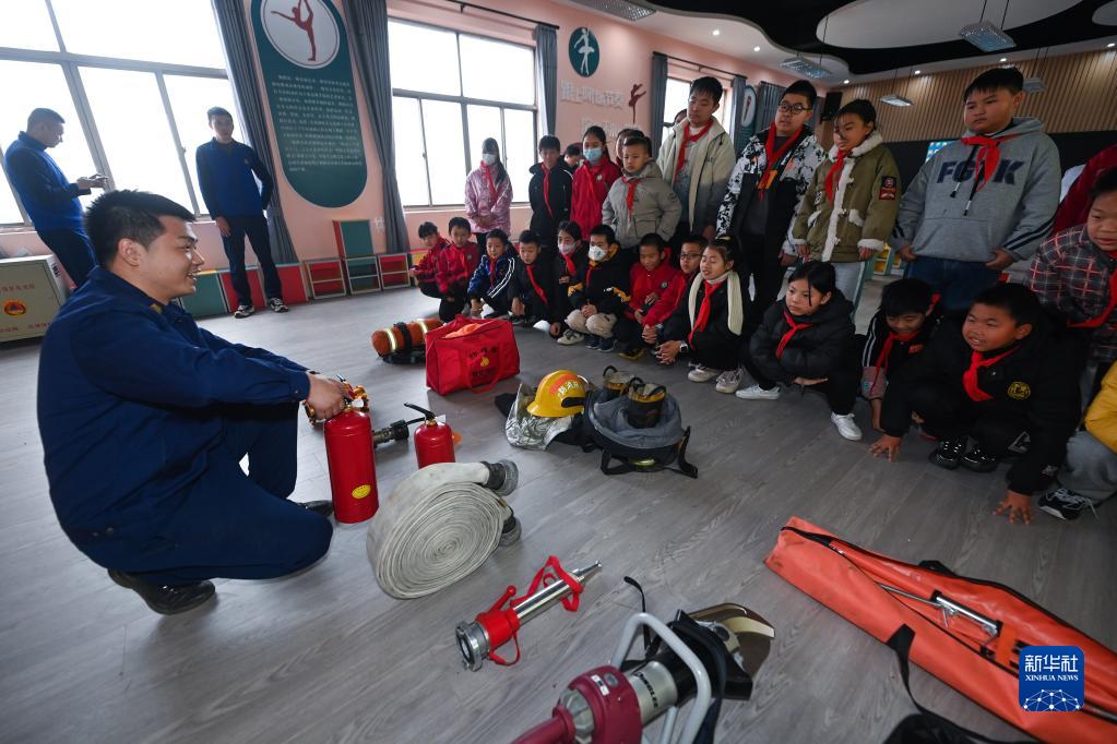 2月9日,東林鎮應急救援隊的隊員在東林鎮第二小學上消防安全課。