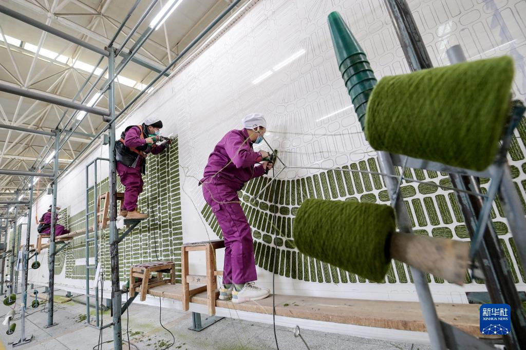 女工們在圣源地毯集團有限公司生產車間內使用槍刺工藝制作地毯(2月4日攝)。