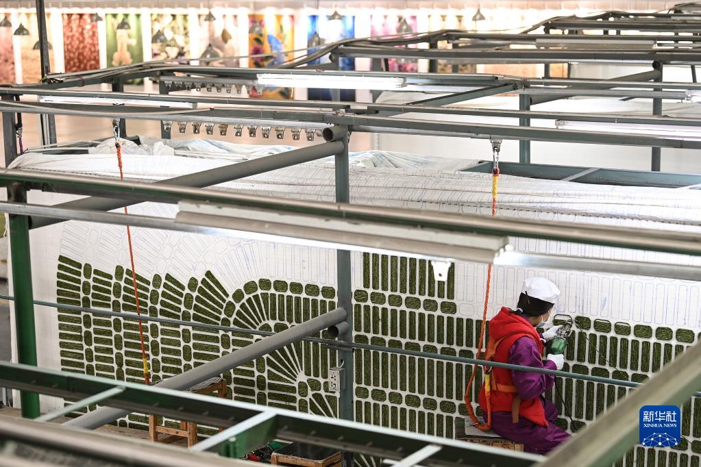 一位女工在圣源地毯集團有限公司生產車間使用槍刺工藝制作地毯(2月1日攝)。
