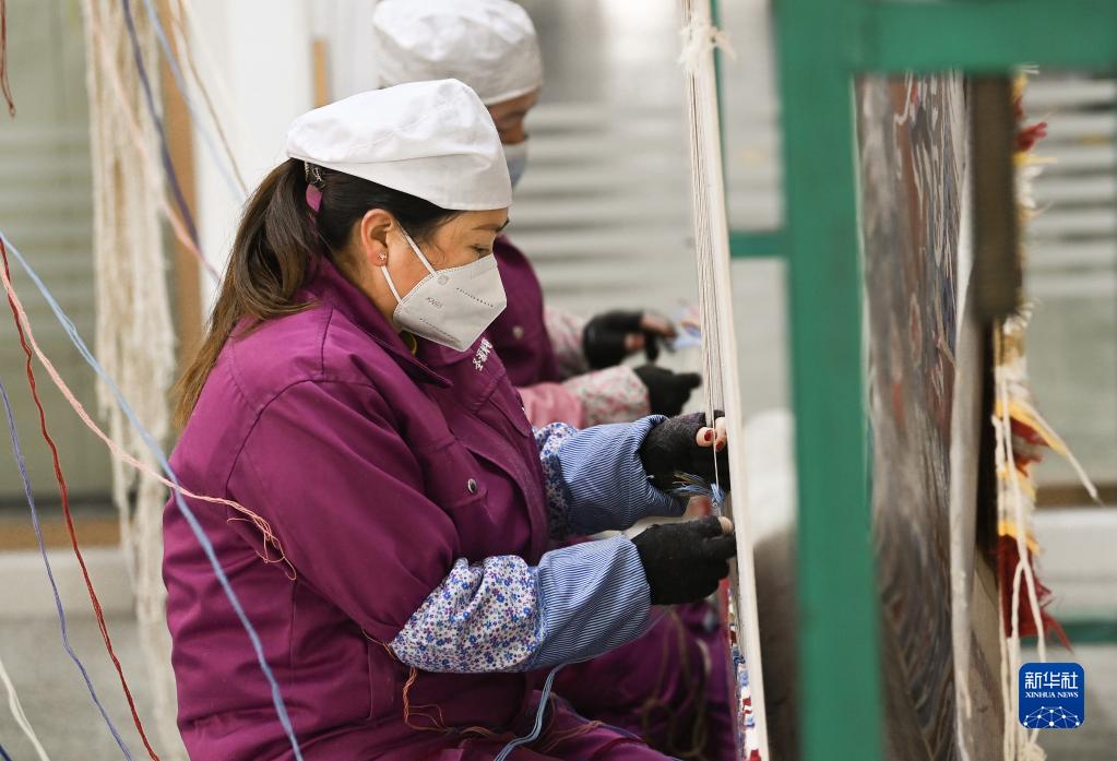 來自工廠附近湟中區東臺村的村民莫秀英(前)和工友在圣源地毯集團有限公司生產車間手工編織地毯(2月1日攝)。