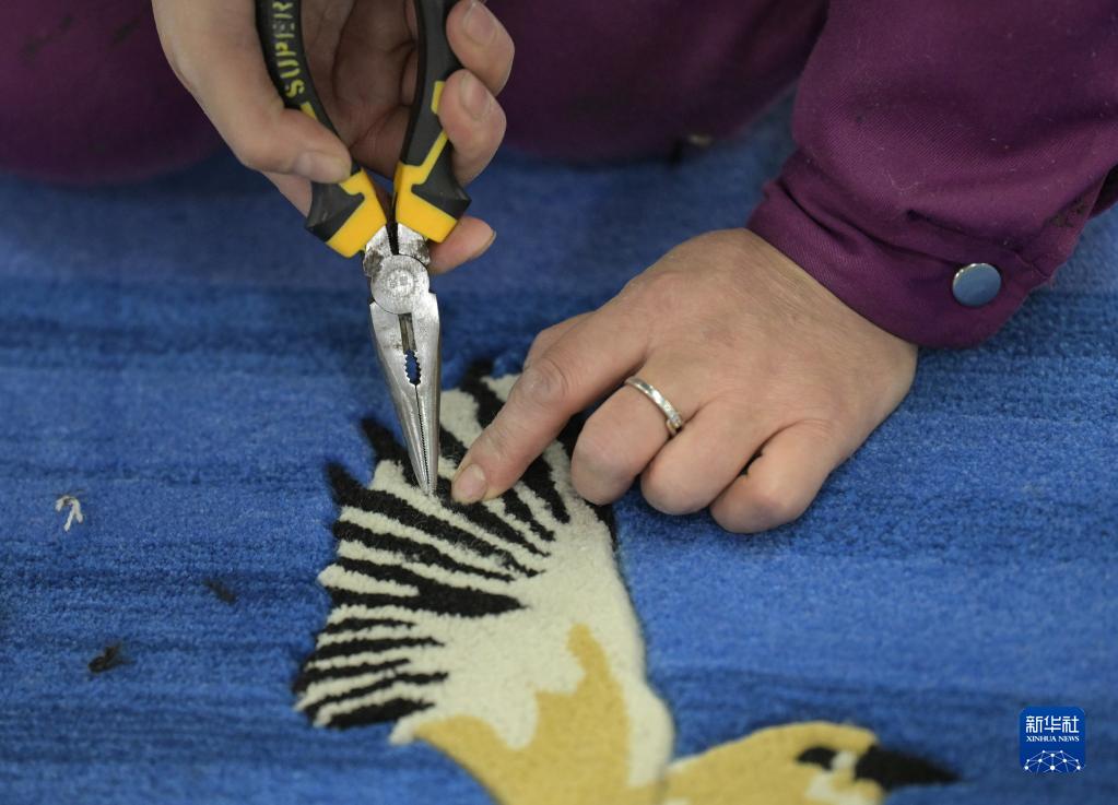 一位女工在圣源地毯集團有限公司生產車間為地毯清理拔花刺(2月4日攝)。