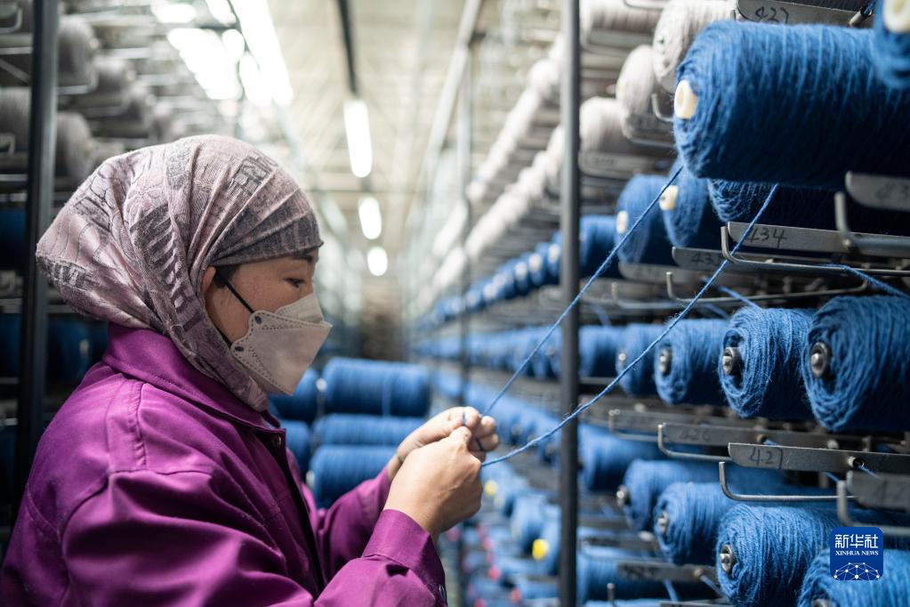 在青海省西寧市圣源地毯集團有限公司生產車間,操作工在接線頭(2月1日攝)。