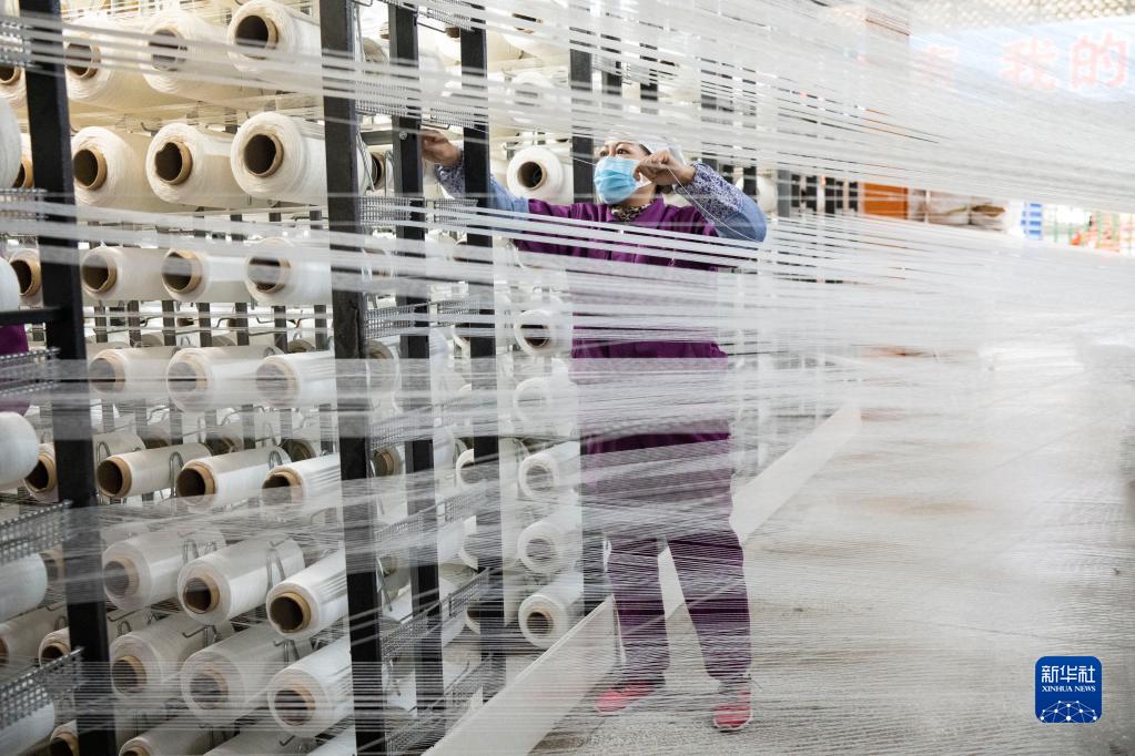 在青海省西寧市圣源地毯集團有限公司生產車間,操作工梳理纏繞的紗線(2月1日攝)。