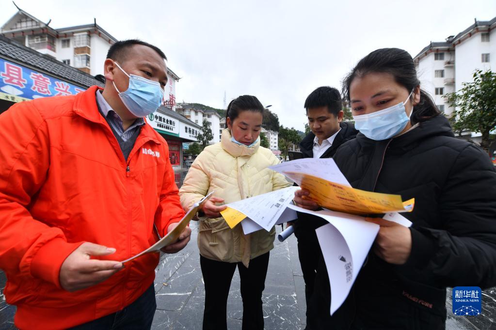 2月9日,在廣西融水苗族自治縣易地扶貧安置點苗美家園社區,求職者和招聘人員在交流。