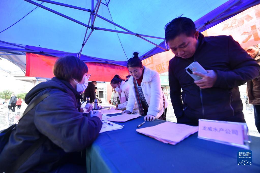 2月9日,在廣西融水苗族自治縣易地扶貧安置點苗美家園社區,求職者和招聘人員在交流。