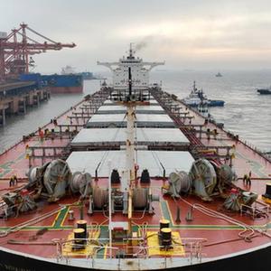 2月9日,一艘輪船在拖輪協助下向唐山港曹妃甸港區礦石碼頭靠泊(無人機照片)。