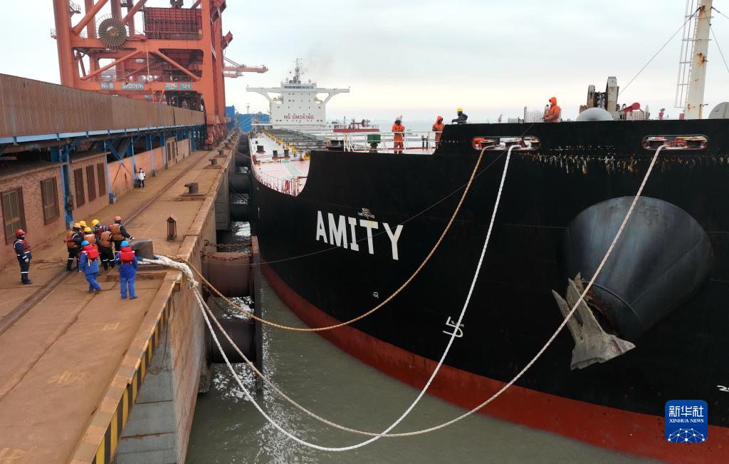 2月9日,工人在唐山港曹妃甸港區礦石碼頭為剛靠泊的輪船系纜繩(無人機照片)。