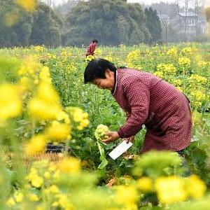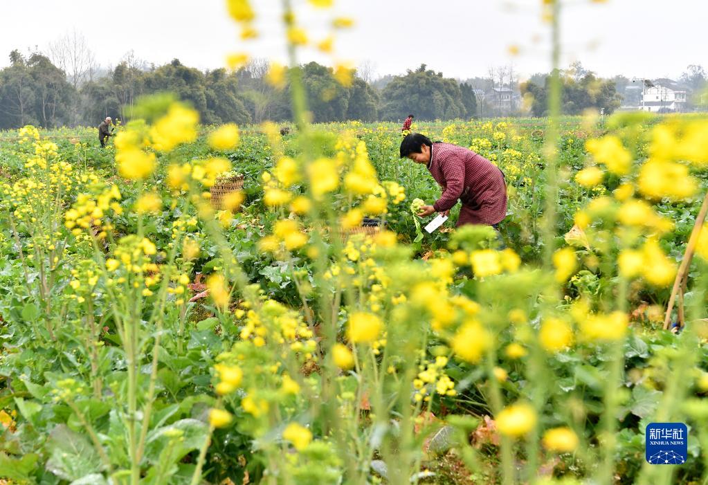 2月9日,四川省廣安市廣安區花橋鎮竹林村的農民在油菜地里砍收套種的青菜頭。