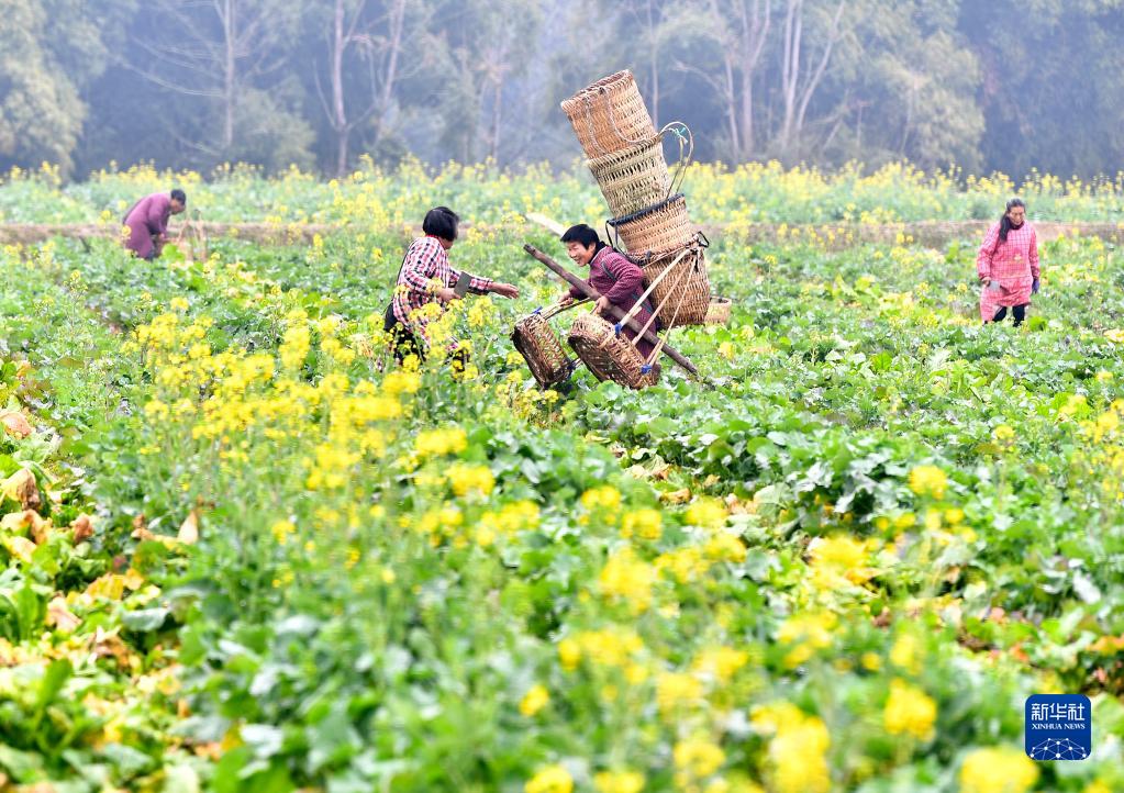 2月9日,四川省廣安市廣安區花橋鎮竹林村的農民在油菜地里砍收套種的青菜頭。