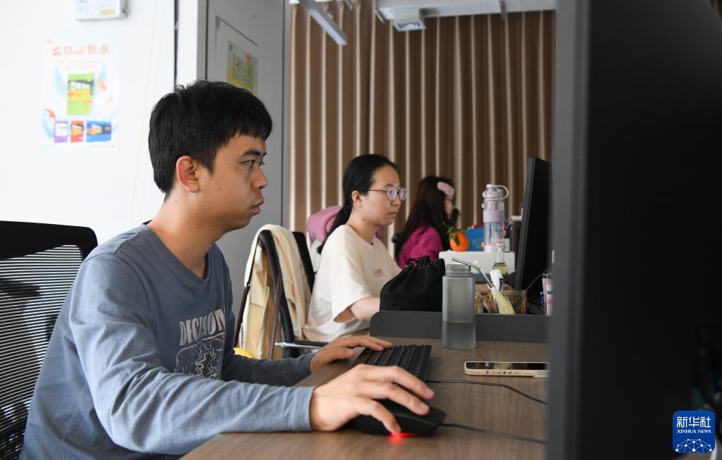 在海南自由貿易港??趶团d城互聯網信息產業園一區內,企業員工在國際離岸創新大廈內辦公(2月8日攝)。
