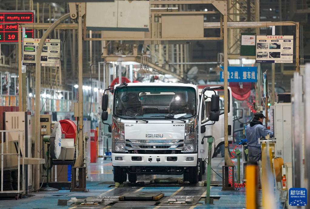 這是2月7日拍攝的慶鈴汽車(集團)有限公司繁忙的商用車整車生產線。