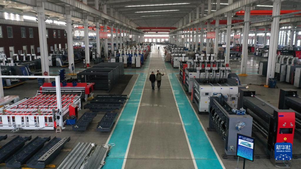 這是2月9日拍攝的滄州市東光縣一紙箱機械設備生產車間(無人機照片)。