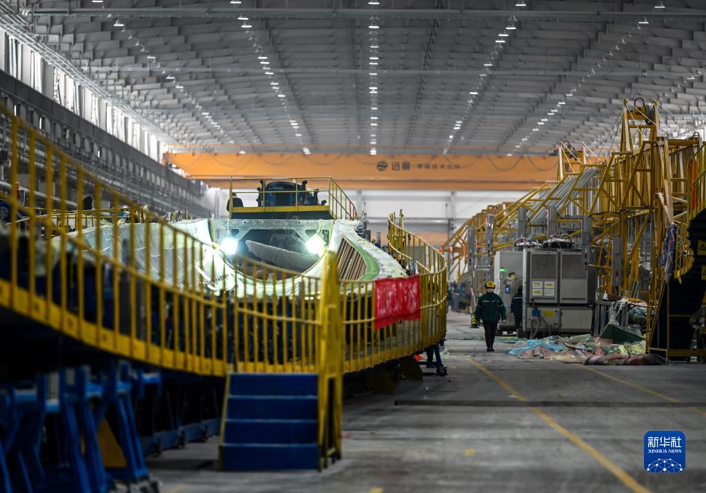 2月9日,在內蒙古烏蘭察布市遠景北方能源有限公司,工人在風機葉片生產線上工作。
