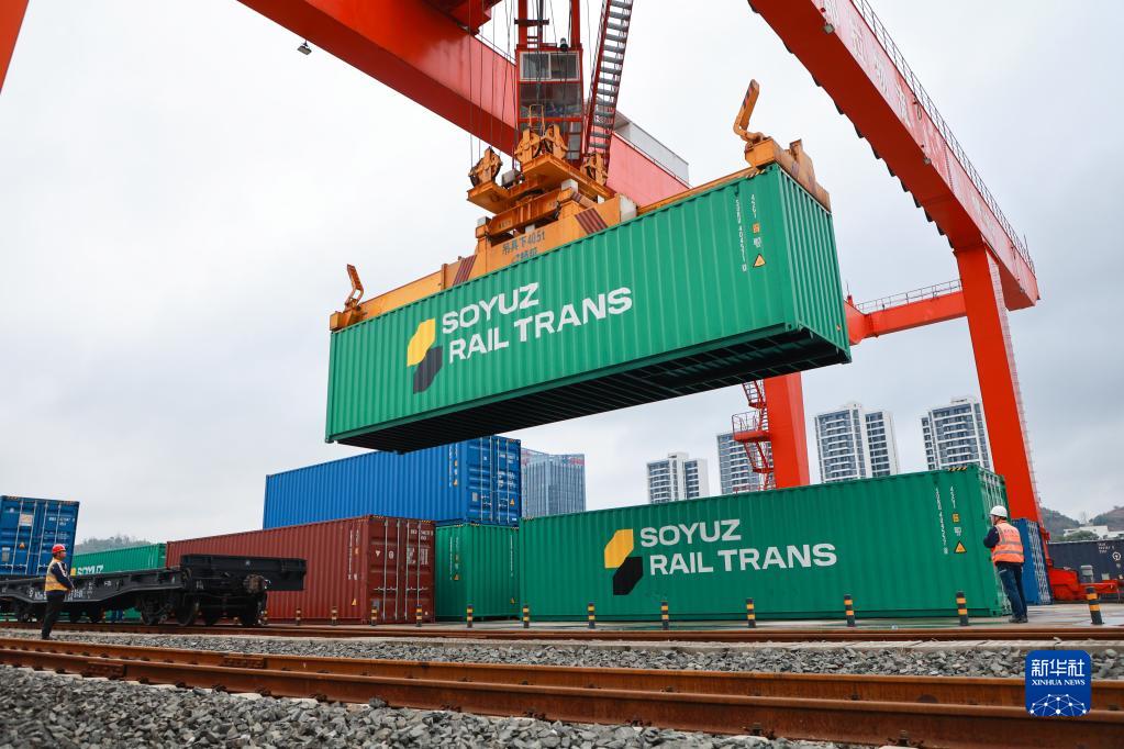 2月9日,一列中歐班列在貴陽國際陸港都拉營站裝載集裝箱。