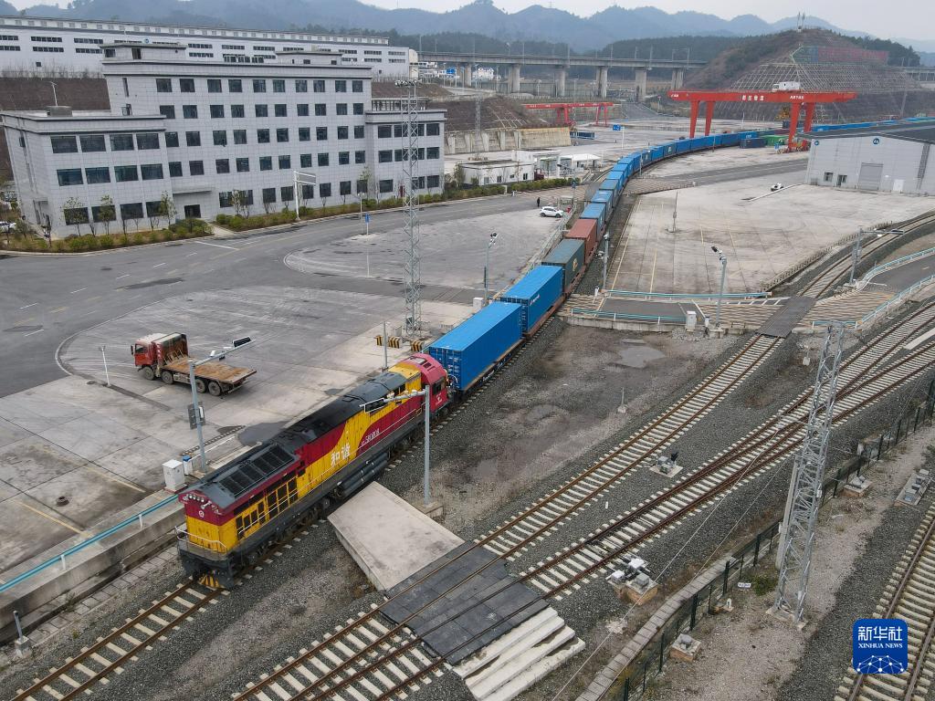 2月9日,一列中歐班列開出貴陽國際陸港都拉營站(無人機照片)。