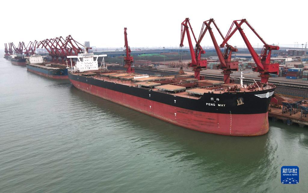 2月9日,滿載鋁礬土的貨船??吭邳S驊港礦石碼頭卸貨(無人機照片)。