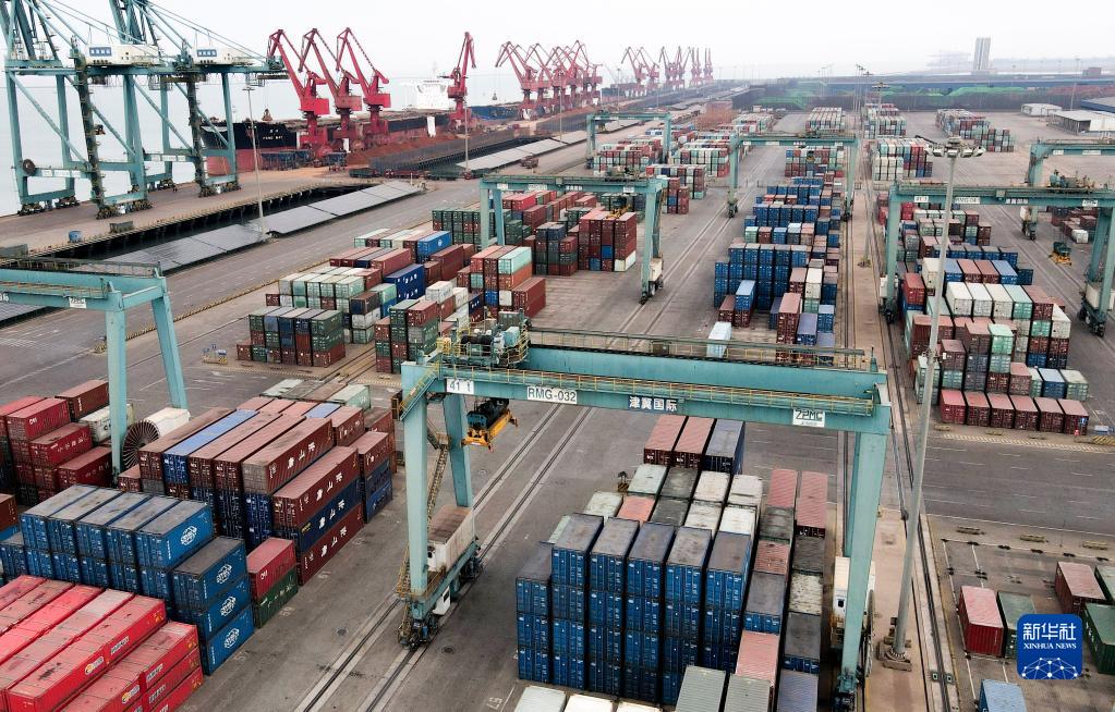 2月9日拍攝的黃驊港集裝箱碼頭(無人機照片)。