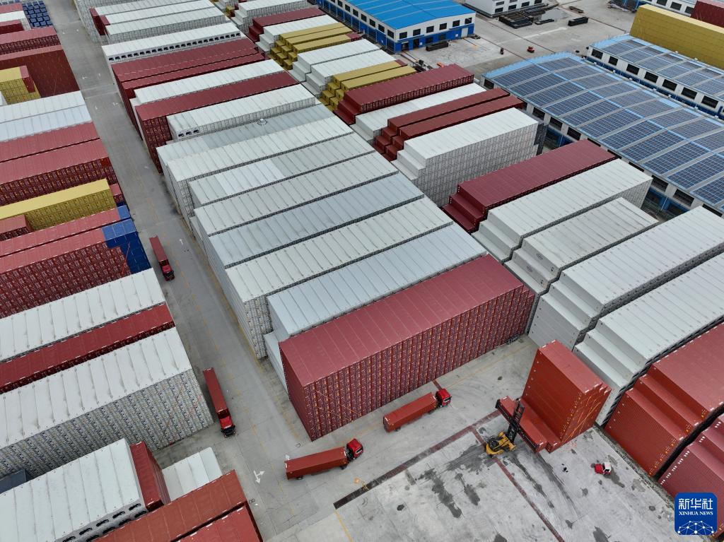在啟東海工船舶工業園拍攝的集裝箱內部轉運作業現場(2月8日攝,無人機照片)。