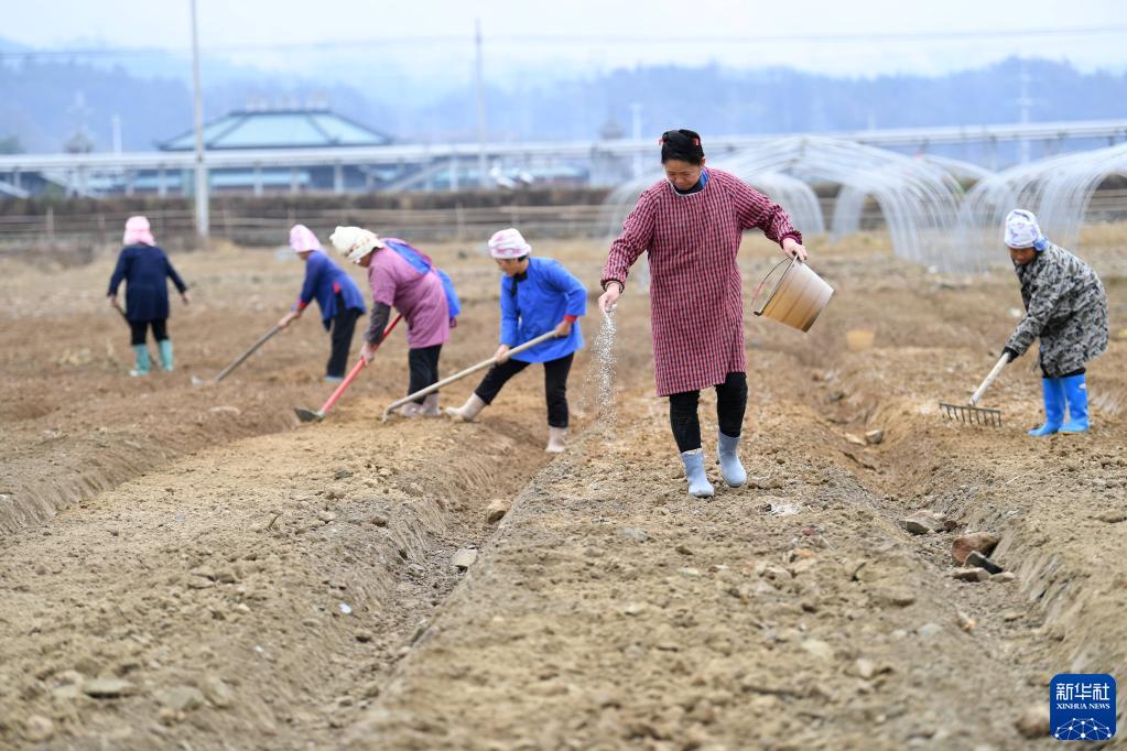 2月9日,在貴州省榕江縣忠誠鎮王嶺村,農民在整地、施肥。